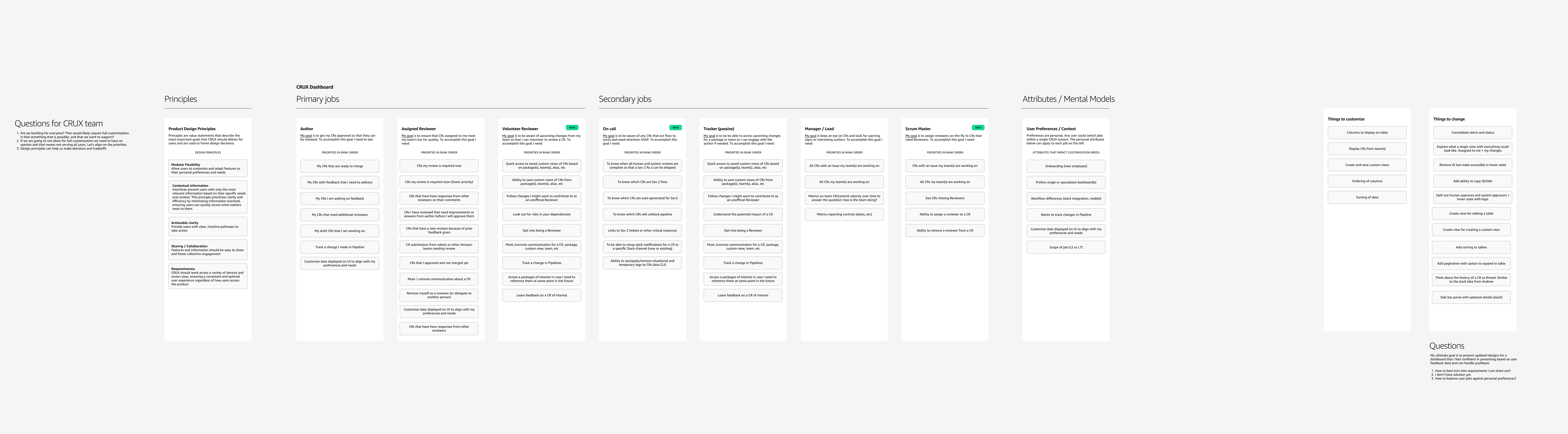 The previous redesign migrated the tool from AngularJS to React — a security fix, not a UX effort. Applying the old layout to Cloudscape spacing cost the density engineers depended on, and the team added more UI to compensate, which crowded the screen without adding clarity. I started with a workshop to map who was actually using the tool. Three primary roles drove the design — Author, Assigned Reviewer, Volunteer Reviewer — each with ranked priorities that shaped every decision that followed.